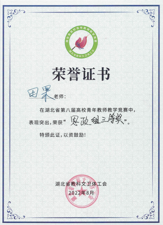 田果老师荣获湖北省第八届青年教师教学竞赛思政组三等奖