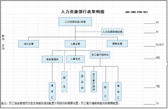 酒店开业时间2010年10月18日,主楼高6层,附楼2层,客房总数331间(套)。其人事部构架如下: