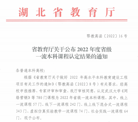 学院获批省级一流本科课程7门,省级优秀基层教学组织3个,省级教学团队1个,省级教学成果奖3项,省级重点培育学科1个,“楚天学者”设岗学科1个,省级战略性新兴产业支柱专业1个,省级专业综合改革试点项目1个。