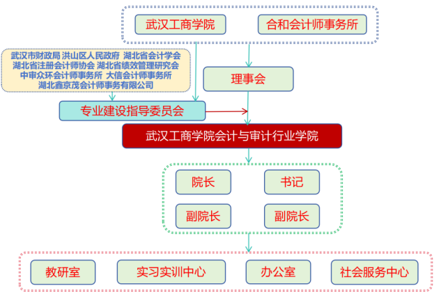 2022年5月,合和会计与审计行业学院揭牌成立,合和(武汉)会计师事务所(特殊普通合伙)入驻校园。合和会计与审计行业学院是学院与合和(武汉)会计师事务所(特殊普通合伙)共同组建的现代产业学院,是湖北省第一家注册会计师产业学院。产业学院建设的定位是,面向会计、审计行业需求,通过校所联合办院,建立产教深度融合机制,创建集“产、学、研、创、用”于一体的人才培养平台。行业学院具体建设举措包括:健全组织机构;校企双方共定人才培养方案,新增大量智能化课程;共同打造会计精英班(创新实验班);注册会计师入课表、进课堂;合和所合伙人给新生上第一课;开展项目制教学,“学中做”与“做中学”相结合;共编教材、共编教学案例、共同开发课程;实现“课程实习-项目实践-毕业就业”的无缝对接。编印了6集行业企业课程资源教学案例;编写产教融合教材3部;获得21项学科竞赛、创新创业竞赛国家级奖项;获得220万元横向课题研究经费;46名注册会计师承担教学任务;每年接纳学生实习100余人次,每年接受教师实践10余人次;每年接受学生就业及推荐其他大中型会计师事务所就业50余人。