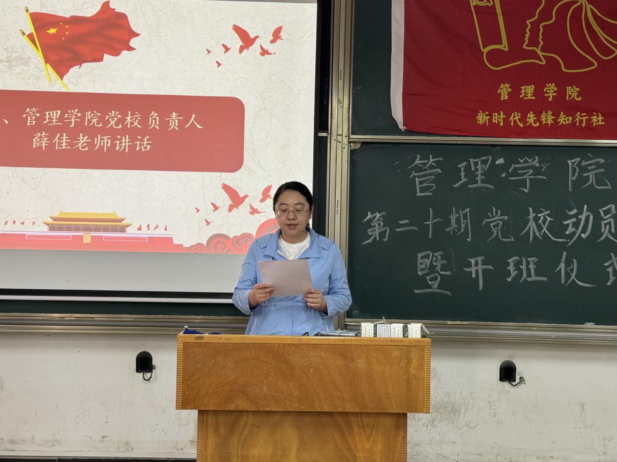 随后,管理学院党校负责人薛佳老师发言。老师在发言中对全体学员提出要求,要求学员增强对党的认识,端正自身态度,刻苦学习,让自己切实在党校学习生活中成熟起来,争取早日成为一名党员。