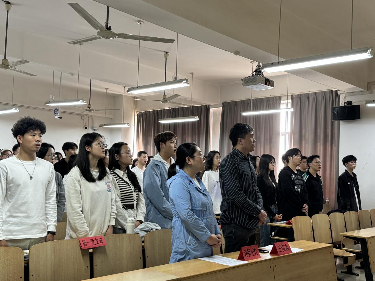会议伊始,全体起立,奏唱国歌。同学们唱的铿锵有力并且眼神坚定,透露出的是对党的敬畏与崇拜,展现出的是全体学员的蓬勃朝气和积极向上的精神面貌,体现出的是他们对入党的坚定信念。