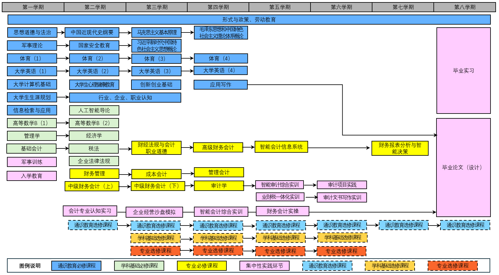 8.终身学习与持续发展能力:树立自主学习与终身学习的理念,能够跟踪会计行业前沿动态;通过考取CPA、CMA等执业资格证书,持续提升专业能力。 | 8.1树立自主学习与终身学习的理念,能够跟踪会计行业前沿动态,适应会计行业变革与信息技术发展,不断更新知识结构。 | 大学英语,人工智能导论,毕业论文(设计) |