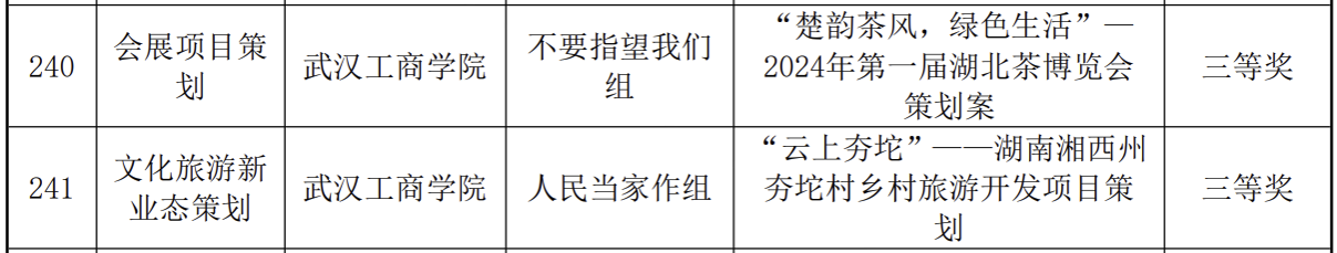 据悉,获得一等奖的两个项目分别聚焦于旅游新业态,“非物质文化遗产数字博览会策划”“咸宁药姑山康养旅游策划”为文旅与会展行业提供全新的发展思路和实践路径。二等奖项目涵盖“乡村旅游开发策划”和“旅游目的地营销策划”,在推动行业创新发展的同时,也积极倡导了可持续发展的理念。三等奖项目则聚焦于“茶博会策划”和“乡村文旅创新”,为行业注入新的活力和动力。
