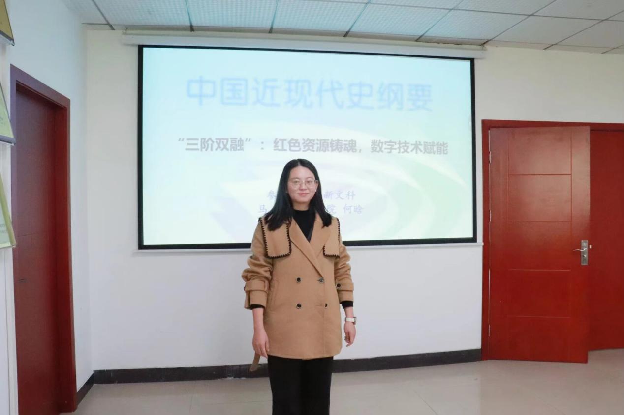 随后,何晗老师上台进行汇报,她以“三阶双融:红色资源铸魂,数字技术赋能”为题,深入阐述了中国近现代史纲要课程的创新举措。何晗老师依次对课程概况、课程荣誉、创新模式及取得的成果进行了详尽而精彩的讲解,逻辑严密,内容丰富。评委老师们对此给予了高度评价,并提出了相关问题,同时也指出了若干不足之处,期望何晗老师能够持续精进。