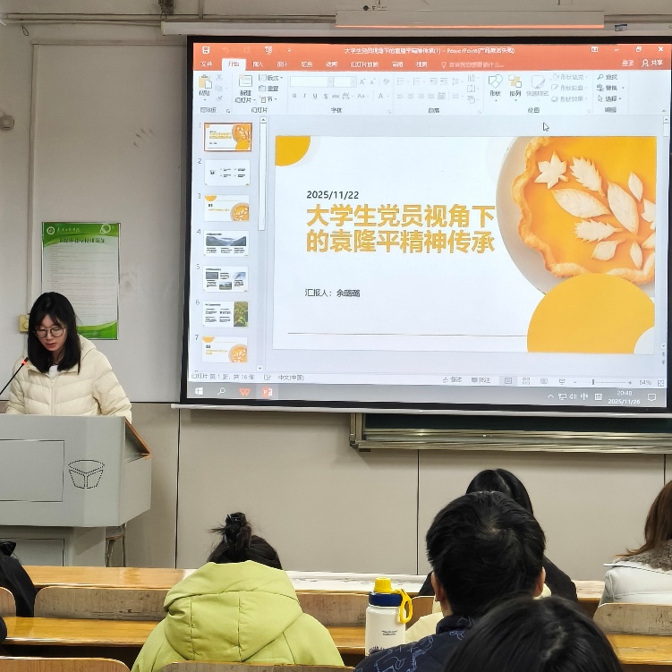 第三位是余璐璐同志,她从大学生党员视角出发,带来“袁隆平精神传承”主题演讲。她系统阐释了袁隆平精神的核心品格:60余年扎根田野的实干精神,攻克杂交水稻技术、破解粮食安全难题的使命担当,面对无数次实验失败仍百折不挠的科研坚守。余璐璐同志谈到,袁隆平院士“把论文写在大地上”的务实作风、心系苍生的人文情怀,对青年党员成长具有深刻启迪。她分享了榜样引领下的行动方向:要将专业知识与民生需求精准对接,把短期目标与终身使命有机衔接,通过参与科研实践、基层服务等方式传承科学家精神。作为青年党员,更要推动红色基因与科研精神融合创新,通过多维平台传播榜样事迹,让袁隆平精神在青年群体中代代相传。