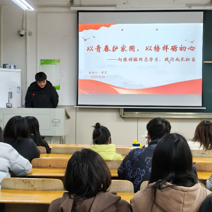 第二位分享者是雷志同志,他以“以青春护家国,以榜样砺初心——向陈祥榕同志学习,践行成长担当”为题展开演讲。他详细介绍了00后战士陈祥榕的英雄事迹:这位年轻战士怀着对祖国的赤诚之心投身军旅,在边境冲突中始终将战友与国家利益置于首位,用生命诠释了“清澈的爱,只为中国”的精神内核。雷志同志谈到,陈祥榕的事迹让他对“忠诚”“担当”“奉献”有了全新认知——忠诚是深入骨髓的信仰,担当是青年一代的使命,奉献可在平凡中彰显伟大。他表示,作为新时代青年,将以陈祥榕为榜样,在思想上厚植爱国情怀,在行动上直面困难挑战,在作风上锤炼务实品格,在格局上主动奉献付出,把榜样精神转化为成长路上的不竭动力。