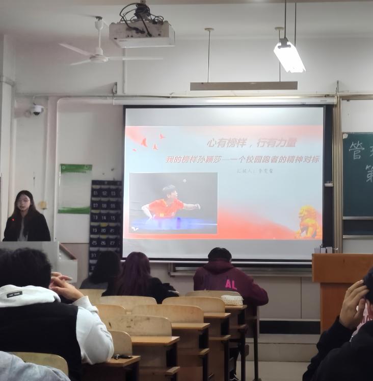 第五位分享者李雯馨同志以乒乓球世界冠军孙颖莎为榜样,生动讲述了这位运动员如何用拼搏精神激励自己的训练生涯。她表示,孙颖莎面对"极点"时永不言弃的坚韧、将万千复杂归于"好好练呗"的纯粹初心,以及始终将国家荣誉置于首位的担当,深深触动了她。作为一名校队400米运动员,她将从榜样身上汲取力量,在训练中勇于突破生理与心理的极限,把对国家的热爱转化为为校争光、为体育强国建设贡献青春力量的实际行动,让拼搏精神在赛场上闪耀。