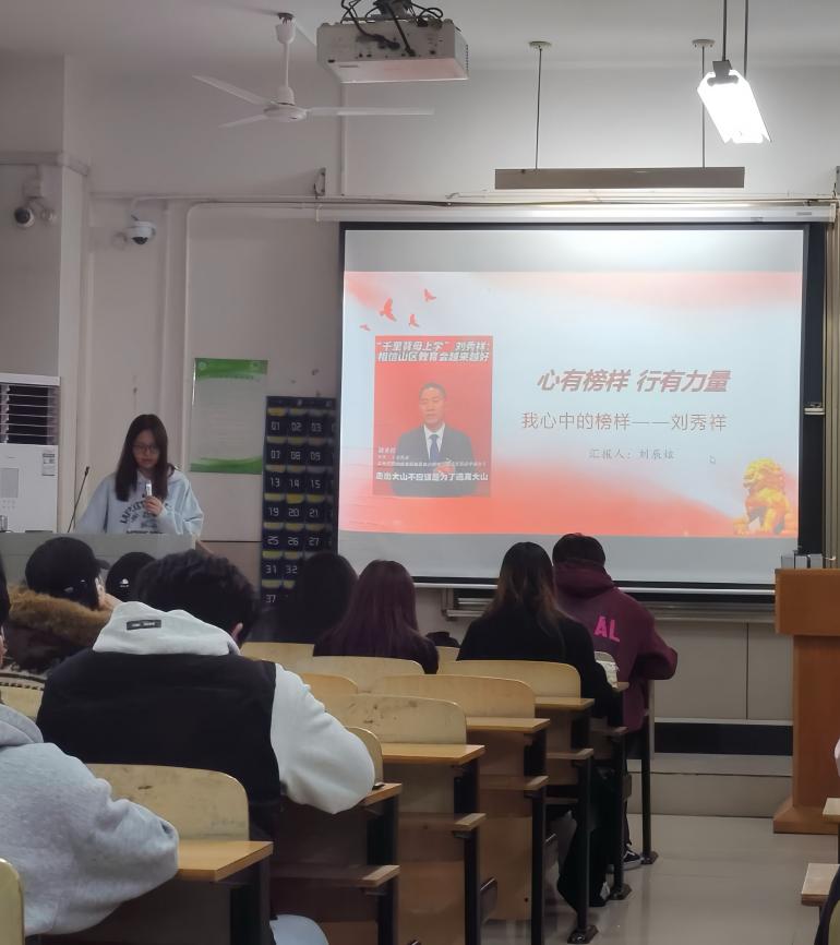第二位分享者刘辰炫同志以“最美教师”刘秀祥为榜样,讲述了其从“背母求学”到“山区燃灯者”的感人历程。她表示,刘秀祥老师身处绝境却坚韧不拔、始终向上的精神,以及功成后毅然返乡、用教育反哺家乡的担当,深深震撼并激励了她。从榜样身上,她学到了“困境并非终点,而是奋斗起点”的深刻道理,并立志在未来学习与生活中,既要勇于迎难而上、坚守初心,也要心怀她人、乐于奉献,将个人成长融入服务集体、回报社会的大局之中,让榜样的力量真正转化为前行的实践。