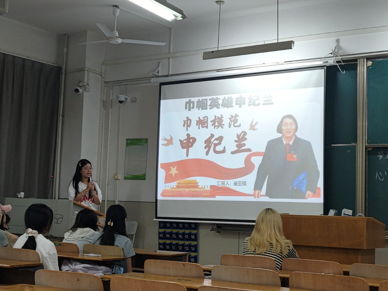 第一位发言人,部员崔亚楠站在讲台上,展示精心制作PPT。大屏幕上,呈现出 “巾帼英雄申纪兰” 的页面,图片中的申纪兰身着正装,面容坚毅,展现出女性的坚韧与担当。详细介绍了申纪兰几十年如一日坚守农村,带领村民开荒种地、发展产业,首创 “男女同工同酬”,为妇女解放和农村发展积极奔走的事迹。