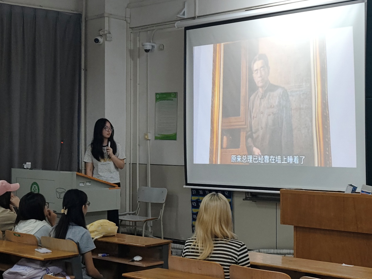 接着部员吴欣洁,和与会人员共同回顾了周恩来总理 “为中华之崛起而读书” 的誓言,他一生为党和人民无私奉献。随后通过一段影像,并伴随着她的讲解,大家仿佛穿越时空,看到了周恩来总理为党和人民无私奉献,以坚定的信仰和卓越的领导才能,为国家和民族的事业鞠躬尽瘁的一生。