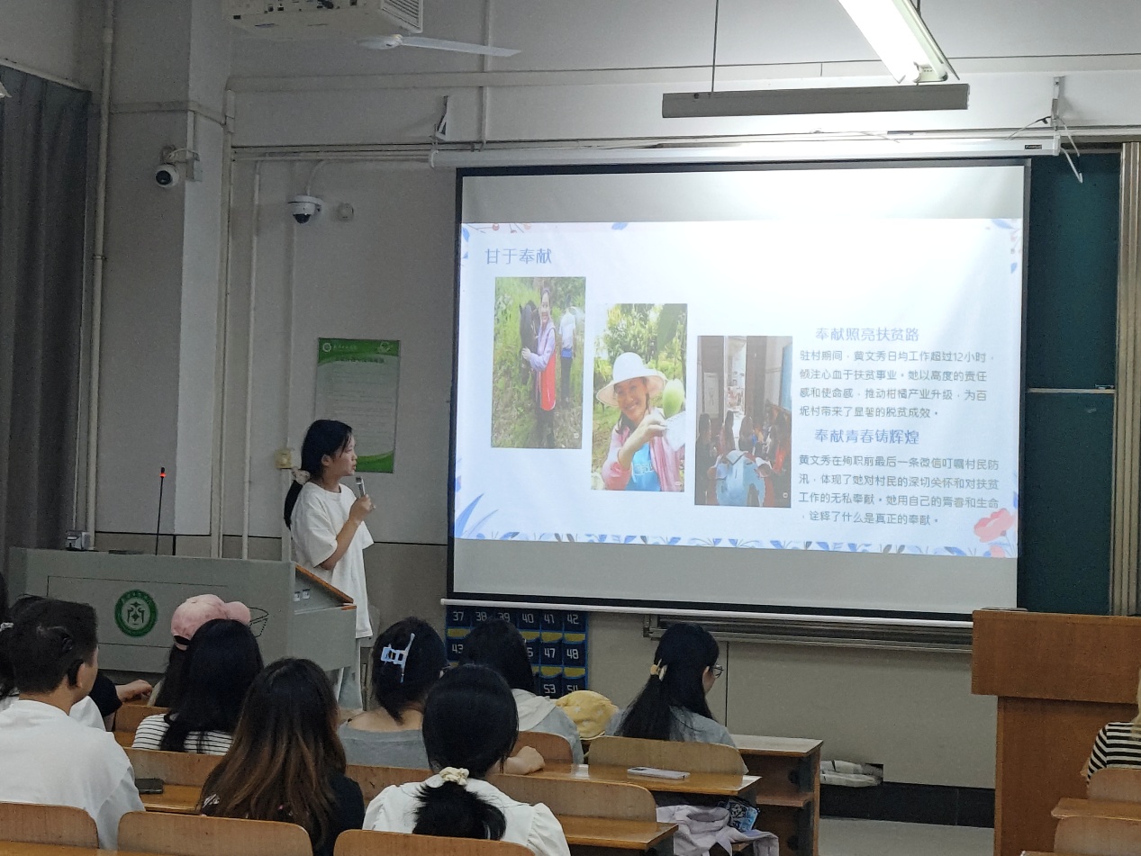 之后,部员邹敏还介绍了黄文秀甘于奉献的事迹,提到她驻村期间工作时长、推动产业发展以及在抗洪防汛时体现的对村民关怀和扶贫工作的无私奉献等将青春献给脱贫攻坚事业,在基层一线默默耕耘,用生命诠释共产党员初心和使命的感人故事。一张张珍贵的历史影像、一段段感人的实干故事,让现场氛围愈发庄重热烈。