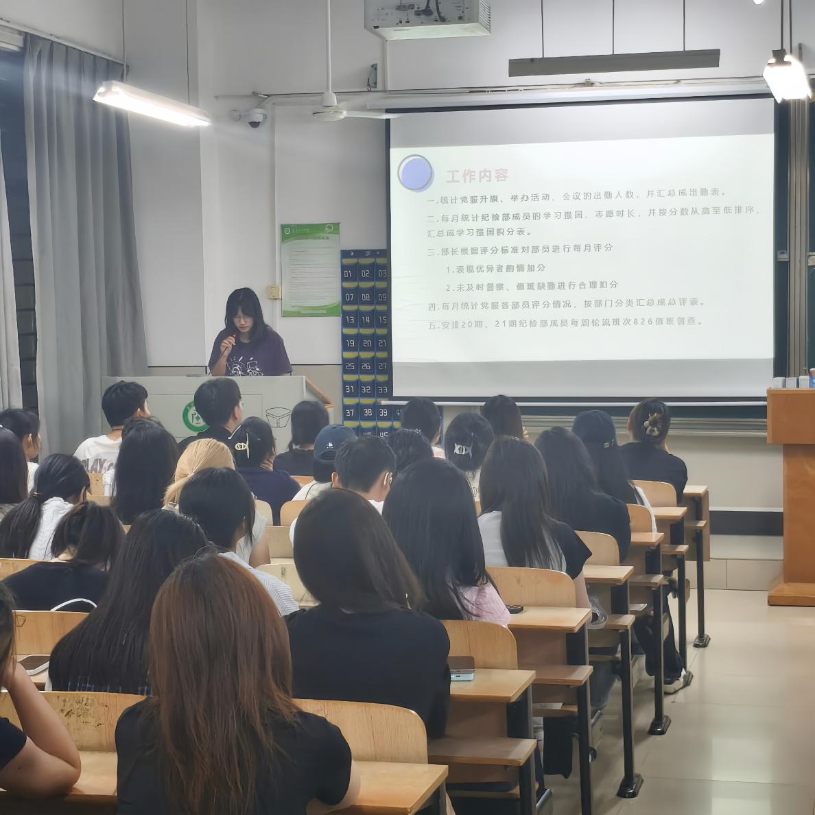 纪检部部长顾欣怡同志围绕纪检部工作内容作专题展示,明确任务格式、报送时限及质量标准,强调态度端正、执行有力是完成各项工作的前提。顾欣怡同志对上学期纪检工作进行全面总结,在肯定部员任务落实成效的基础上,提出“查缺补漏、精益求精”的改进方向,号召全体成员在未来工作中继续发扬务实作风,确保中心纪律要求落到实处。