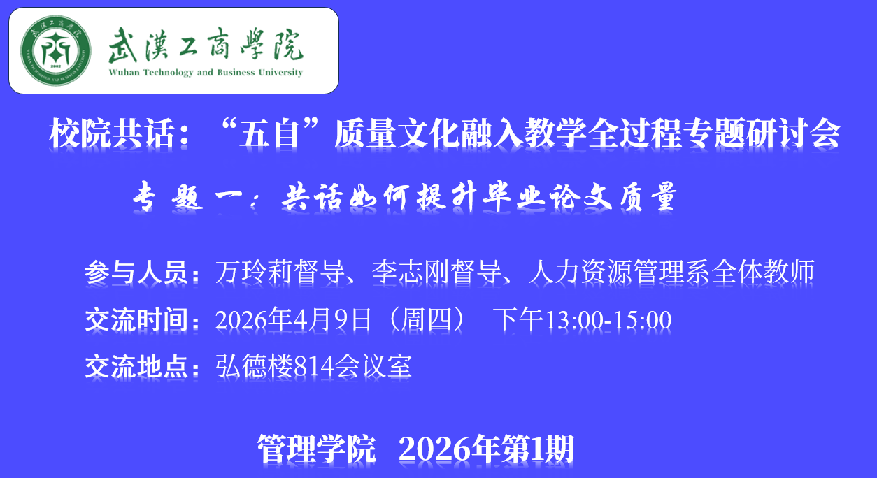 4月9日下午,管理学院在弘德楼814会议室成功举办“校院共话:‘五自’质量文化融入教学全过程专题研讨会”第一期活动。本次研讨会以“共话如何提升毕业论文质量”为专题,邀请万玲莉督导、李志刚督导与人力资源管理系全体教师共同参与。