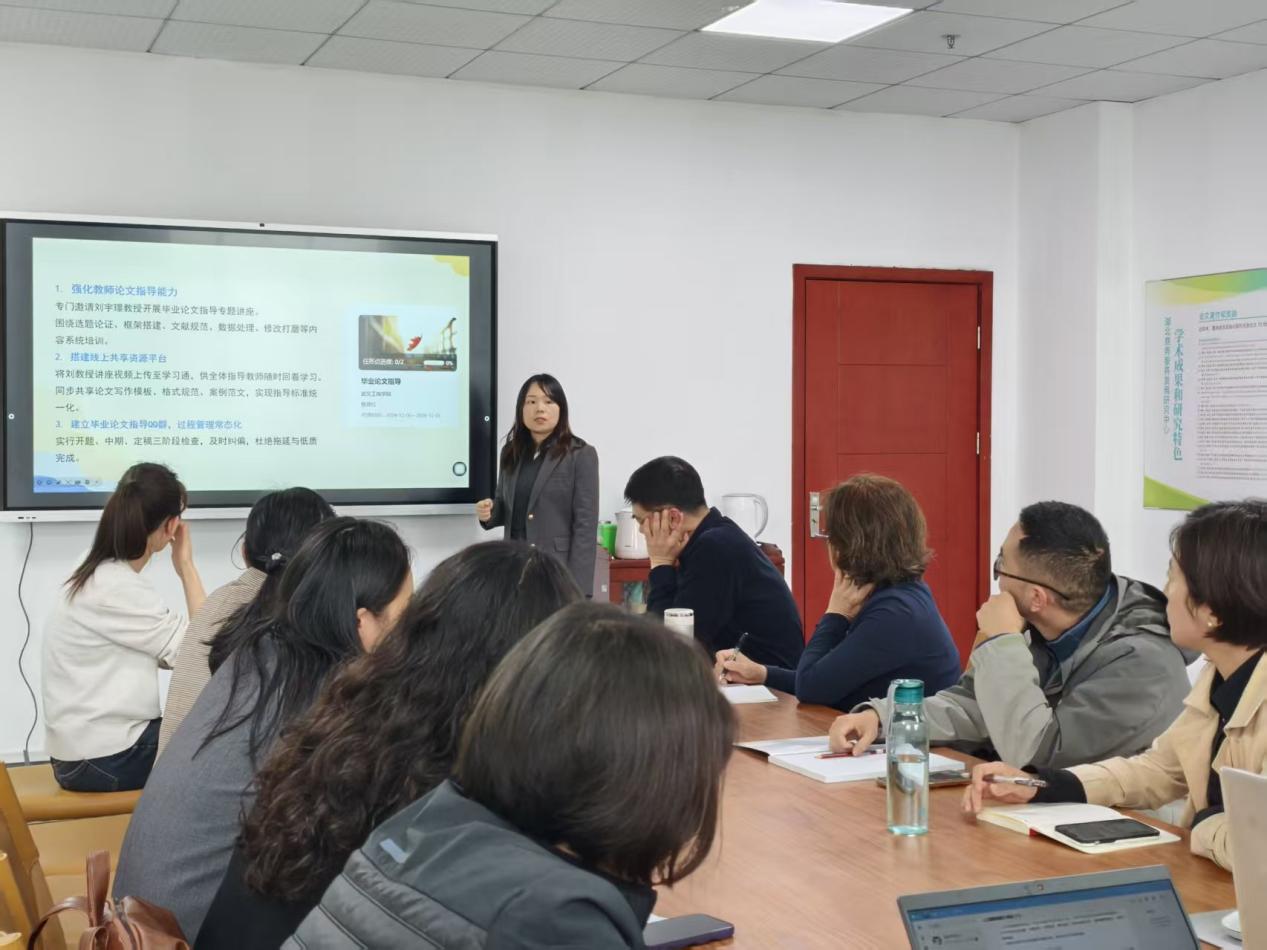 随后,人力资源管理系副主任邓君详细汇报了人力系毕业论文工作进展情况。重点介绍了选题把关、指导过程、能力建设等内容,包括将论文导读与写作课程从选修变为必修等创新做法,精准点出选题同质化、学生写作基础薄弱、AI工具使用不规范等核心问题。