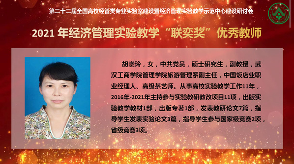 荣 誉:2021年11月13日,第二十二届全国高校经管类专业实验室建设暨经济管理实验教学示范中心建设研讨会表彰决定,胡晓玲老师2021年全国经管类实验教学“联奕奖”优秀教师荣誉称号。