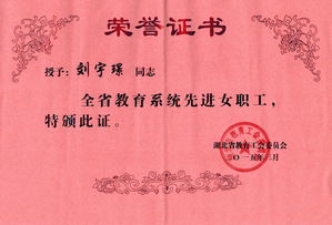 荣 誉:2015年3月,管理学院刘宇璟老师荣获湖北省教育系统先进女教职工的荣誉称号。
