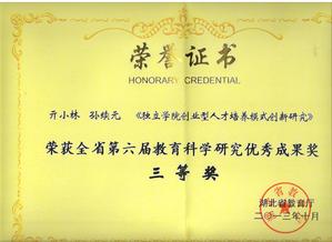 荣 誉:2013年10月,管理学院亓小林和孙续元两位老师的《独立学院创业型人才培养模式创新研究》荣获全省第六届教育科学研究优秀成果奖三等奖。