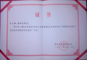 荣 誉:2012年9月,管理学院亓小林、孙续元两位老师的《独立学院创业型人才培养模式创新研究》荣获湖北省第七次优秀高等教育研究成果一等奖。