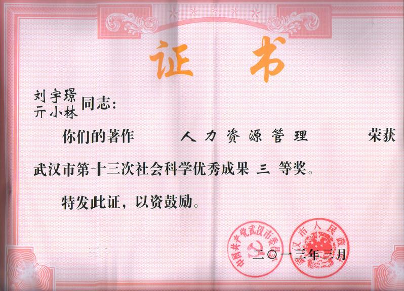 荣 誉:2013年2月,管理学院刘宇璟、亓小林两位老师的著作“人力资源管理”荣获武汉市第十三次社会科学优秀成果三等奖。