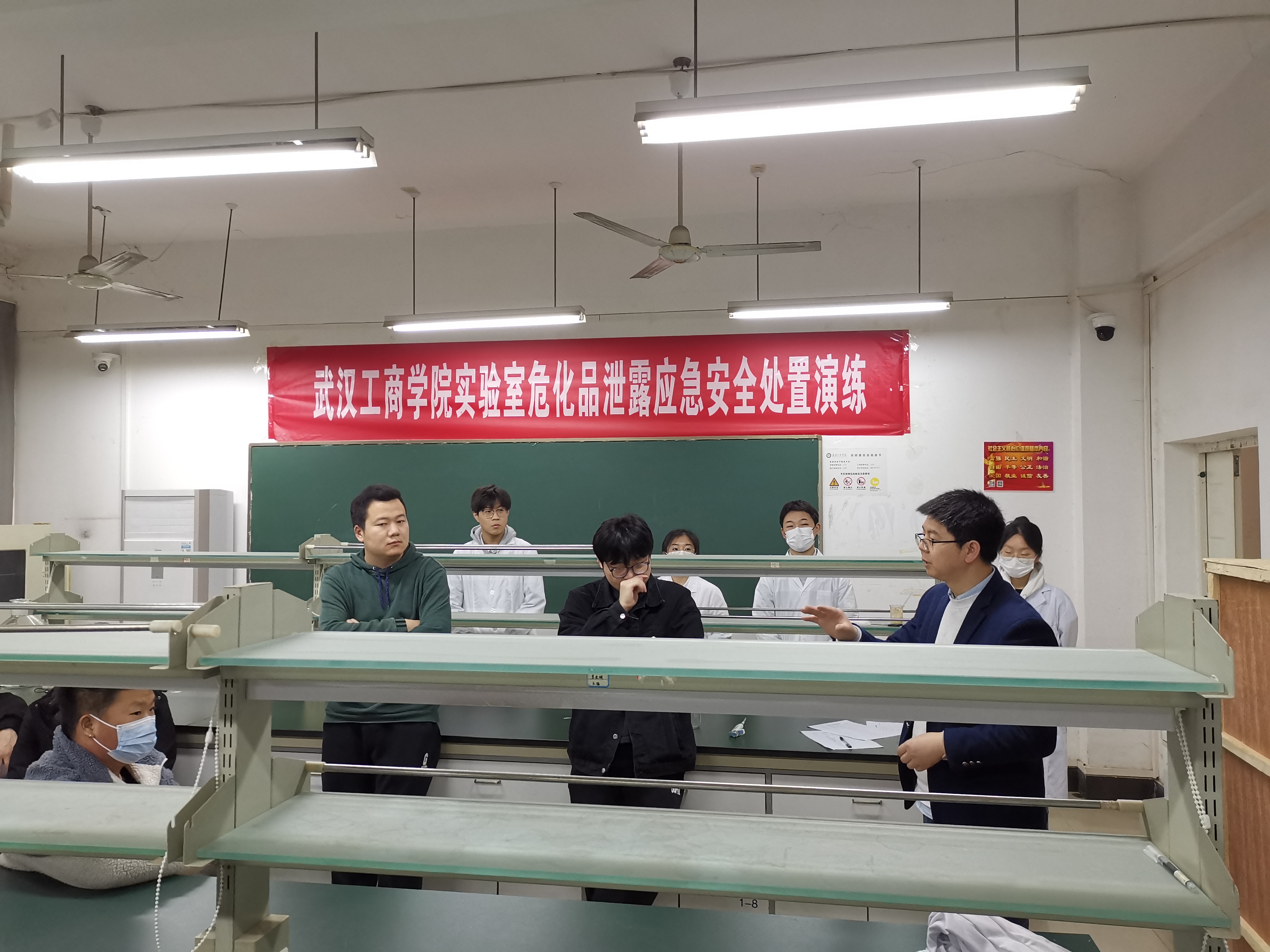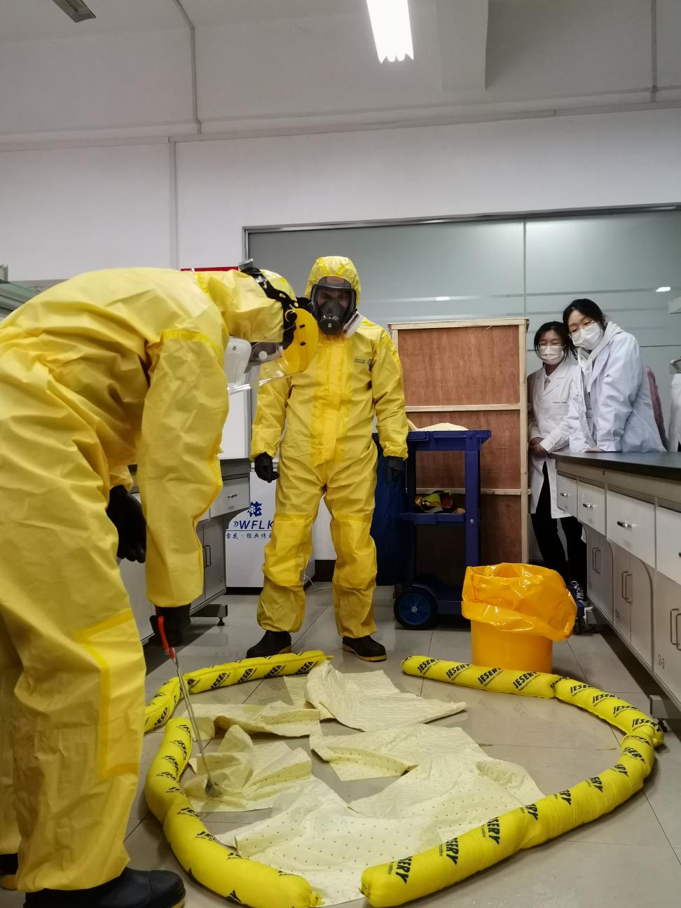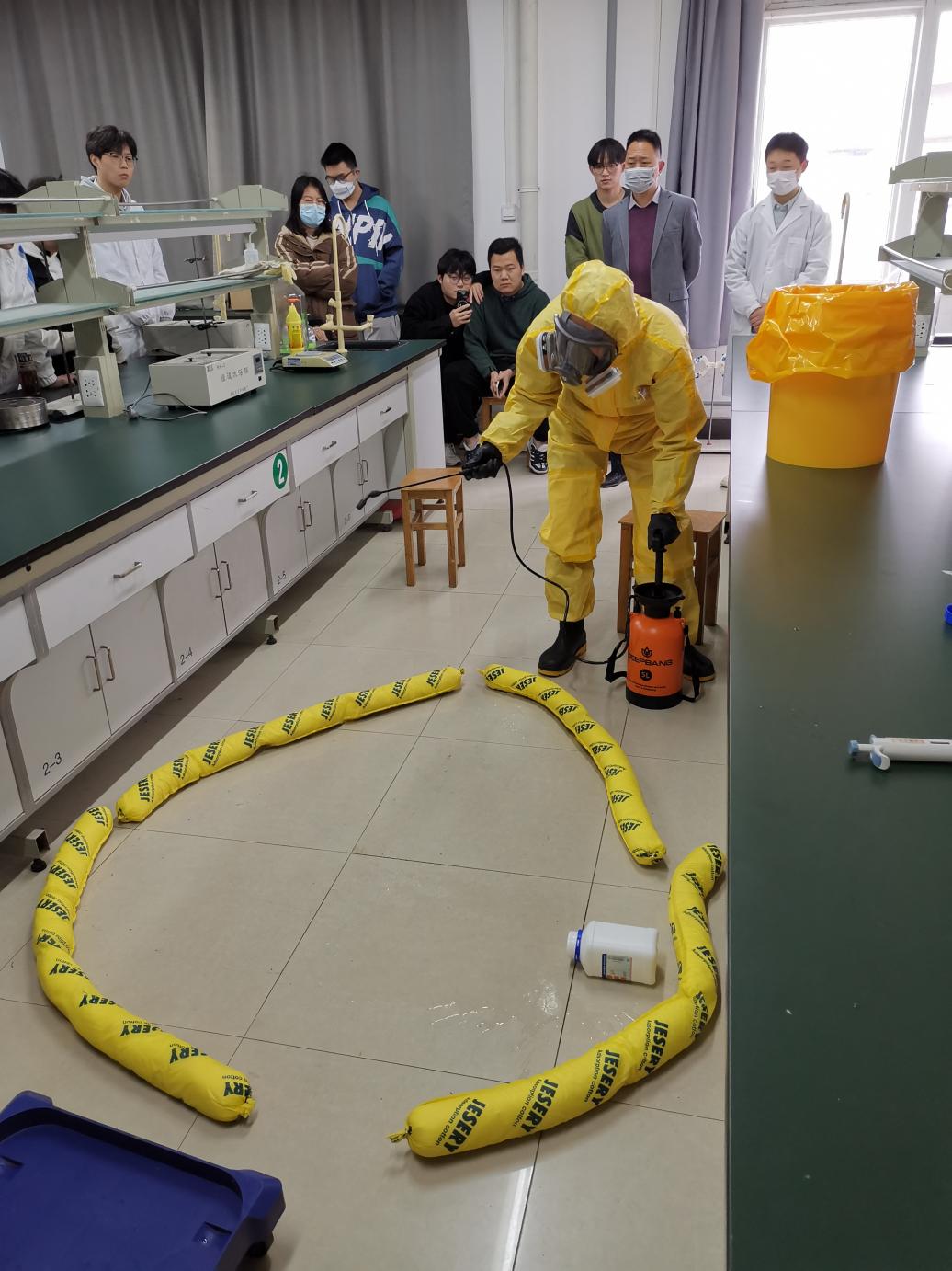下午,为提高培训演练效果,让在场每位学生听得懂、看得清、学得会。演练过程让学生角色扮演实验室的相关人员参与其中,通过一边讲解一边示范,将危险化学品泄漏后实验人员个人救护、紧急动员、事故处置等应急处置规范化流程完整呈现。环生学院龚乃超老师、徐文广老师在演练中扮演应急处置小组成员,通过现场详细的展现了实验室安全防护设施的正确使用方法,以及应对危险化学品泄露的正确处置流程。