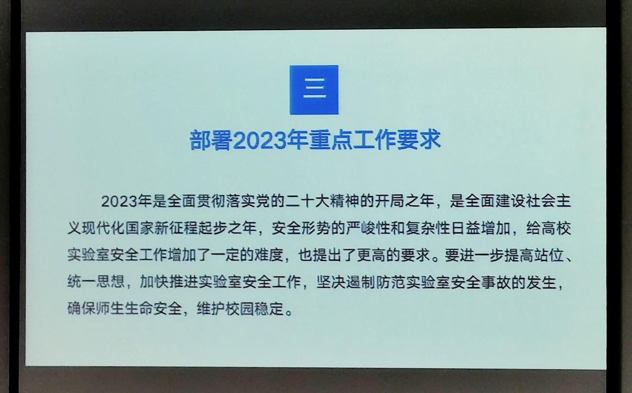本次会议主要是为确保高校实验室安全运行,保障广大师生人身安全和校园稳定,落实《教育部办公厅关于组织开展2023年高等学校实验室安全检查工作的通知》(教科信厅函〔2023〕8号)要求,将2023年实验室安全检查工作进行部署,邀请专家对《高等学校实验室安全规范》、《高等学校实验室安全检查项目表(2023年)》内容以及本年度检查重点进行详细解读,并就高校实验室安全基础理论、管理实践等内容进行报告交流。