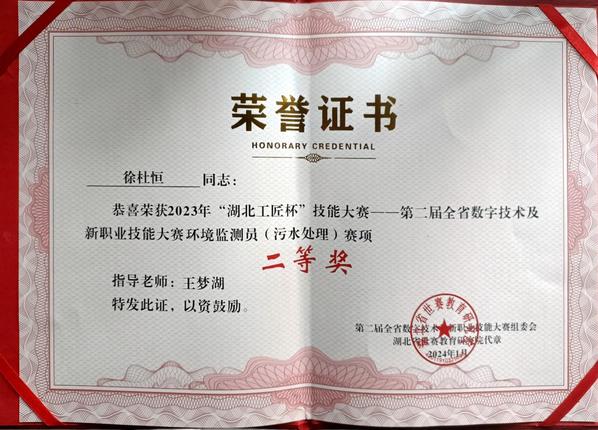 近日,环生学院21级环境工程专业4班徐杜恒和何文欣同学分别获得“湖北工匠杯”技能大赛——第二届全省数字技术及新职业技能大赛组委会颁发的环境监测员(污水处理)赛项的二等奖和优胜奖。他们的出色表现为学院赢得了荣誉,也为学生树立了榜样。