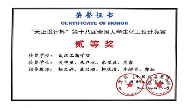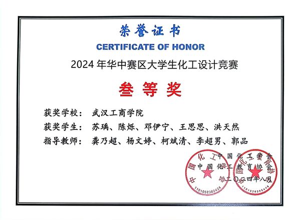 近日,传来喜讯,环生学院学子在备受瞩目的“天正设计杯”第十八届全国大学生化工设计竞赛、2024年华中赛区大学生化工设计竞赛中脱颖而出,喜获大赛二等奖与三等奖。此次获奖不仅是对环生学院学生专业素养和创新能力的充分肯定,也是对学院较强教育教学实力的有力证明。