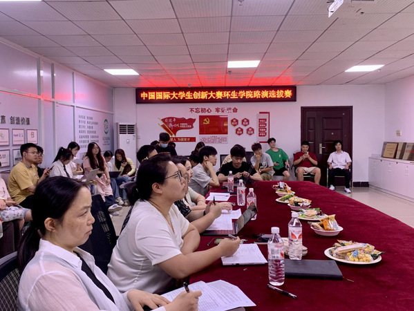 2025年5月29日中午,环生学院在综合楼1118会议室成功举办了“中国国际大学生创新大赛”院内路演选拔赛。本次大赛旨在激发学生的创新思维,选拔优秀项目代表学院参与校级比赛,为更高层次的角逐做好准备。环生学院党总支副书记王强、副院长郑丹、杨文婷,环境工程系副主任陶玲,以及辅导员兼分团委书记尹佳丽担任了本次选拔赛的评委。他们以专业的视角和丰富的经验,为参赛团队学生提供悉心指导。