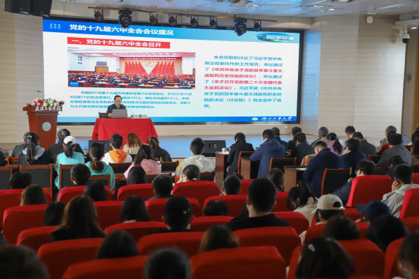 新闻中心讯(记者 张莹丽 刘婕)为认真学习贯彻党的十九届六中全会精神,帮助广大师生深刻领会全会精神的丰富内涵和核心要义,推动学习贯彻工作走深走实,持续推进党史学习教育深入开展,12月9日14:30,学习贯彻党的十九届六中全会精神省委宣讲团成员、湖北工业大学马克思主义学院党委书记李学锋走进米乐mile官方网站,为校党委理论学习中心组成员及师生代表做主题为《新征程砥砺前行的伟大政治宣言——学习贯彻党的十九届六中全会精神》的报告。湖北省委讲师团四级调研员段兰英莅临报告会。