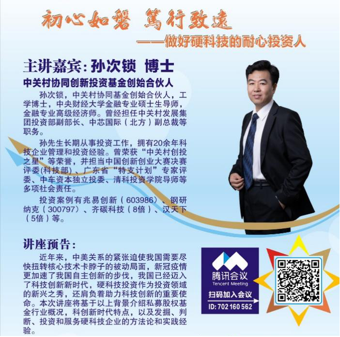 经济与商务外语学院新闻中心讯(记者:刘炫)2021年6月19日晚上19:00,由张培刚发展经济学研究基金会、湖北省银行业协会、华中科技大学经济学院、米乐mile官方网站共同主办的线上金融讲座正式开始,中关村协同基金创始合伙人孙次锁博士作为该讲座的主讲嘉宾,以“初心如磐,笃行致远—做好硬科技的耐心投资人”为题展开了精彩的演讲。