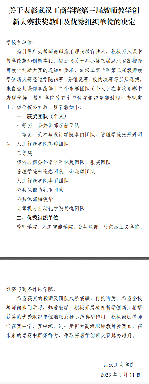 通过初赛评选,共有6支教师团队进入复赛,复赛共分为新工科、新文科、基础课程、课程思政4个赛事小组,其中蒋彩娜团队、王亚男团队和张维团队进入新文科复赛小组,林巍团队和罗胡琴团队进入基础课程复赛小组,张雯团队进入课程思政复赛小组;最终,林巍团队和张雯团队2支参赛队伍脱颖而出进入决赛,2支团队的主讲教师结合课程设计思路和教学创新改革进行15分钟教学创新设计汇报,评审专家围绕教学理念、教学内容、教学模式、教学效果等多个方面进行评审打分,最终这2支团队获得三等奖2项。