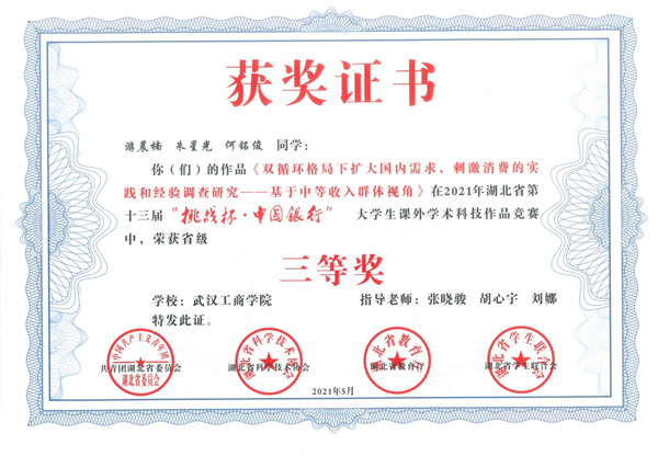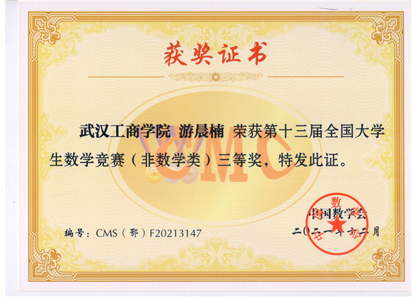 游晨楠的成功不是偶然,大学四年他一直都在为自己的目标努力着。在校期间,游晨楠的专业成绩一直保持着年级第一,获得过两次国家奖学金、三次校级奖学金,以及校三好学生、优秀学生干部等荣誉称号;他还在专业老师的指导下参加了各类学科竞赛,荣获第十三届全国大学生数学竞赛三等奖、第二届全国高等院校数学能力挑战赛优秀奖、第十届湖北省数学竞赛二等奖、第十五届“挑战杯”中国银行全国大学生课外学术科技作品竞赛省级三等奖等奖项。
