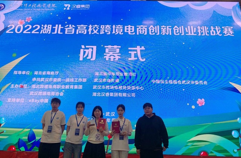 经济与商务外语学院新闻中心讯(记者 王思颖)2023年4月7日,2022湖北高校跨境电商创新创业挑战赛在武汉软件工程职业技术学院落下帷幕。由我院教师蒋彩娜、向灵彦老师指导的学生参赛队伍(国贸专业何鑫丽、王思颖,电商专业陆瑞洋、彭桂凯,财管专业郑文骏)在与湖北30所高校的激烈角逐中,战队出类拔萃,荣获一等奖的好成绩。
