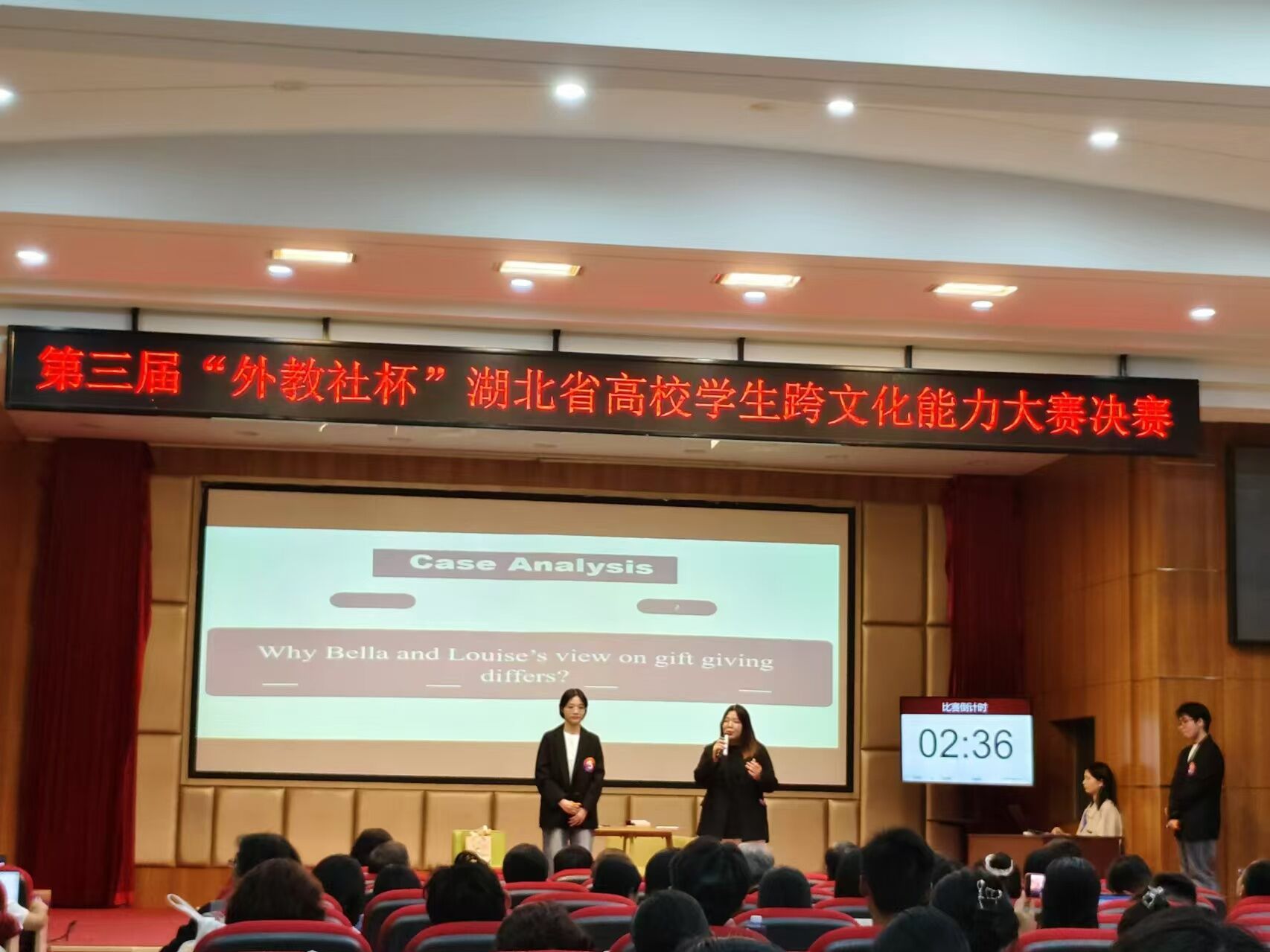 经济与商务外语学院新闻中心讯(记者:徐无名)2024年10月13日,第三届“外教社杯”全国高校学生跨文化能力大赛湖北赛区决赛在湖北工业大学圆满落幕。经济与商务外语学院英语专业2021级学生齐龙飞、杨容与王丽敏凭借出色的表现获得一等奖。