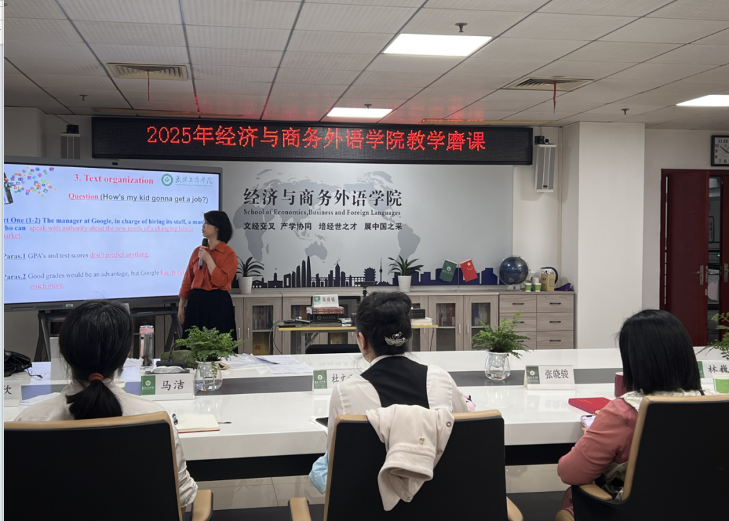 经济与商务外语学院新闻中心讯(记者:杨萌)2025年4月21日上午10:00,经济与商务外语学院在综合楼920会议室开展了2024-2025第二学期教师磨课教研活动,旨在打磨我院教师在教育教学方面的专业能力,提高课堂教学的质量与水平。此次活动邀请到了学校督导杜文君教授、经济与商务外语学院院长张晓骏教授、副院长马洁教授、学院督导林巍副教授、公共外语系副系主任黄欣副教授,为夏金玲老师进行磨课。