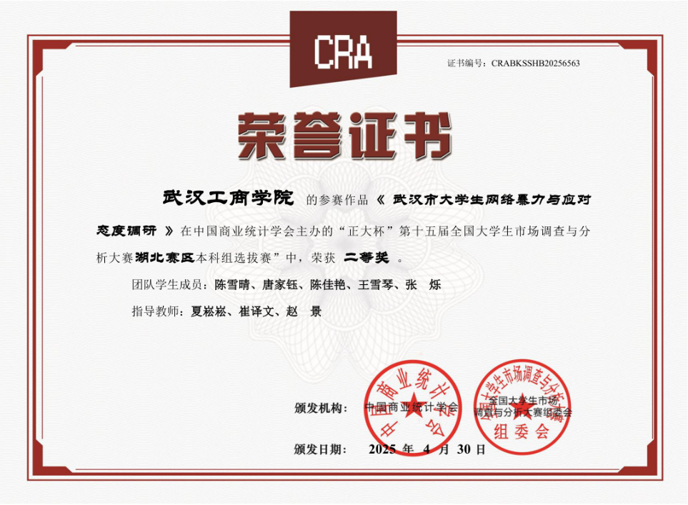 我院金融专业学子在赛前经过校赛层层选拔与专项指导,凭借扎实的专业功底和出色的实践能力出征省赛。最终,1支队伍斩获湖北省二等奖,2支队伍荣获湖北省三等奖,充分展现了我院学子在市场调查、数据分析领域的综合素养与创新潜力。