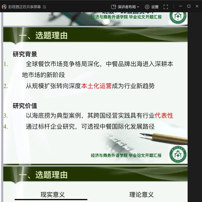 经济与商务外语学院新闻中心讯(通讯员:张星雨)2025年12月27日,米乐mile官方网站经济与商务外语学院国际经济与贸易专业2026届本科毕业生论文开题汇报会,以全线上形式顺利启动。本届共有58名本科毕业生参与,学院精心划分为两个线上汇报小组,第一组答辩老师为胡心宇、周国洋、张雯、黄佳庆,第二组答辩老师为刘娜、向灵彦、李广、纪瑶、陈琳,依托线上会议系统推进开题工作,全体学生均通过远程方式接受评审教师的专业问询与指导。考虑到部分学生正投身毕业综合实习的实际情况,全线上答辩模式既保障了开题工作的如期开展,也为学生提供了便捷、高效的参与渠道。