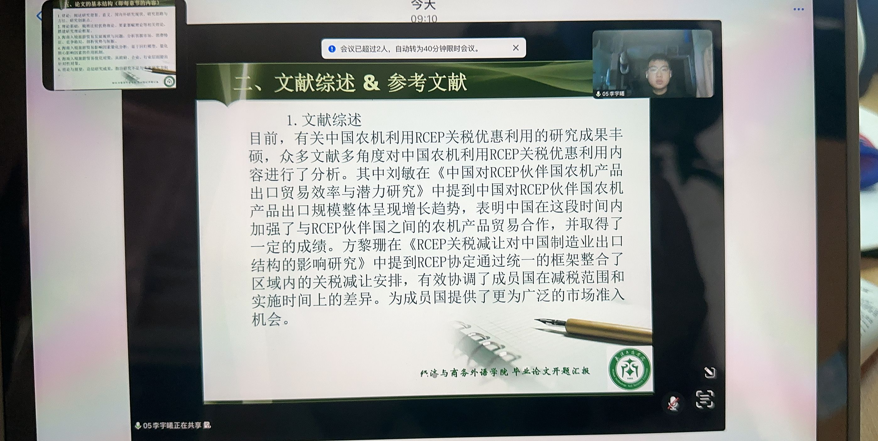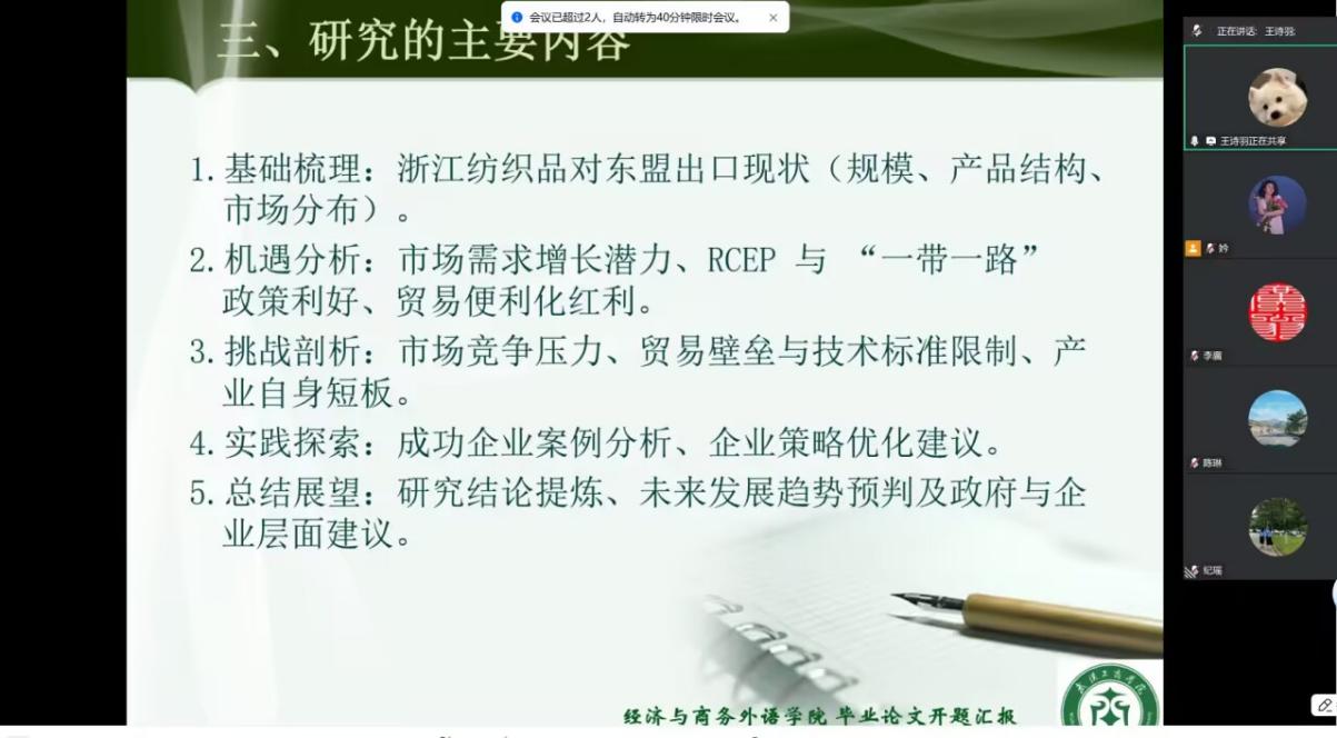 上午9时,汇报会正式启动。线上会场营造出严谨务实又不失活跃的学术氛围,学生们按照3-5分钟的时限,依次通过线上会议系统阐述选题初衷、研究价值、文献梳理情况、拟采用的研究路径及论文整体框架。从跨境电商供应链优化、RCEP协议下中小外贸企业发展路径,到数字经济赋能国际贸易转型、绿色贸易背景下农产品出口突破策略等选题,充分彰显了国贸专业本科学生立足行业前沿的学术视野与扎实的专业知识储备。