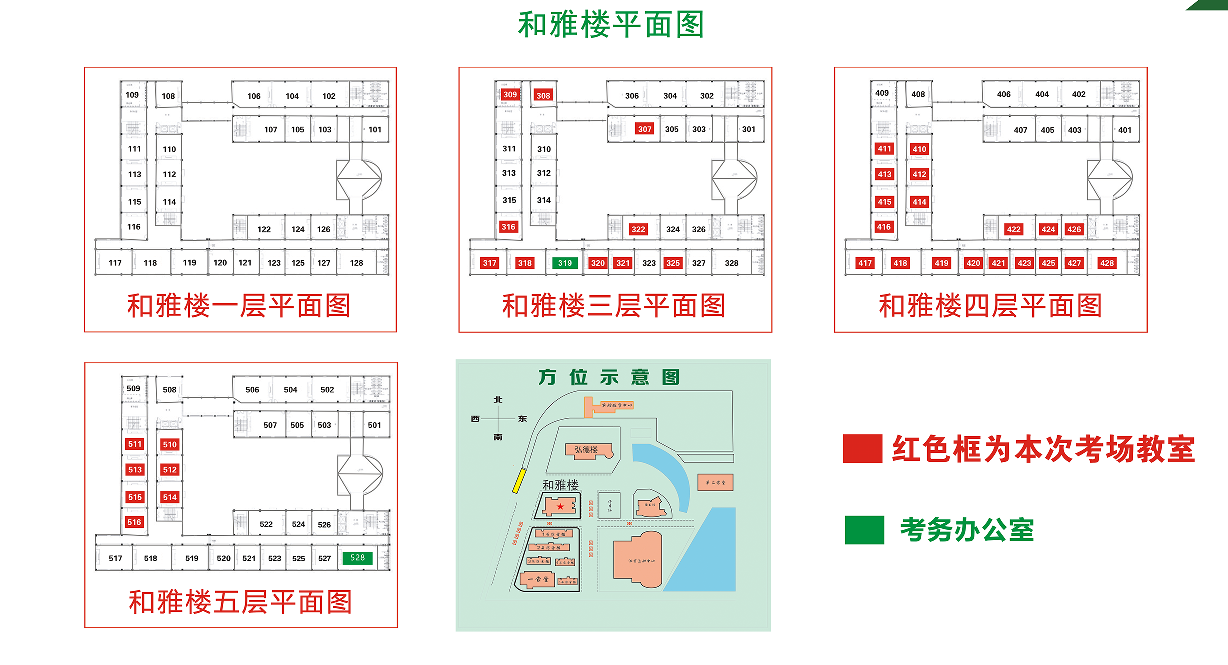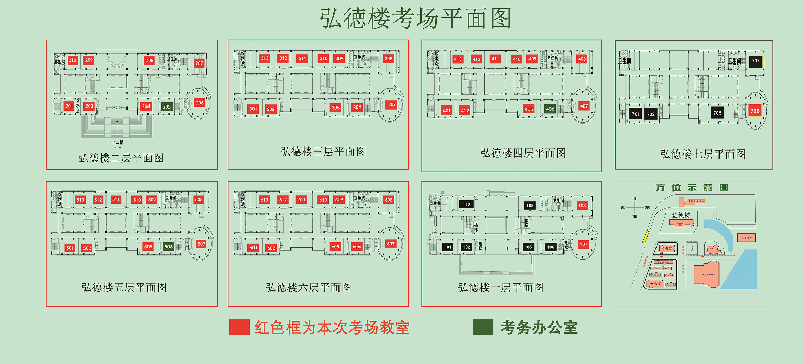 2. 考场分布及考场示意图。我校考场楼栋弘德楼(1-79考场)、和雅楼(80-114考场)设置考场,具体楼栋信息如下: