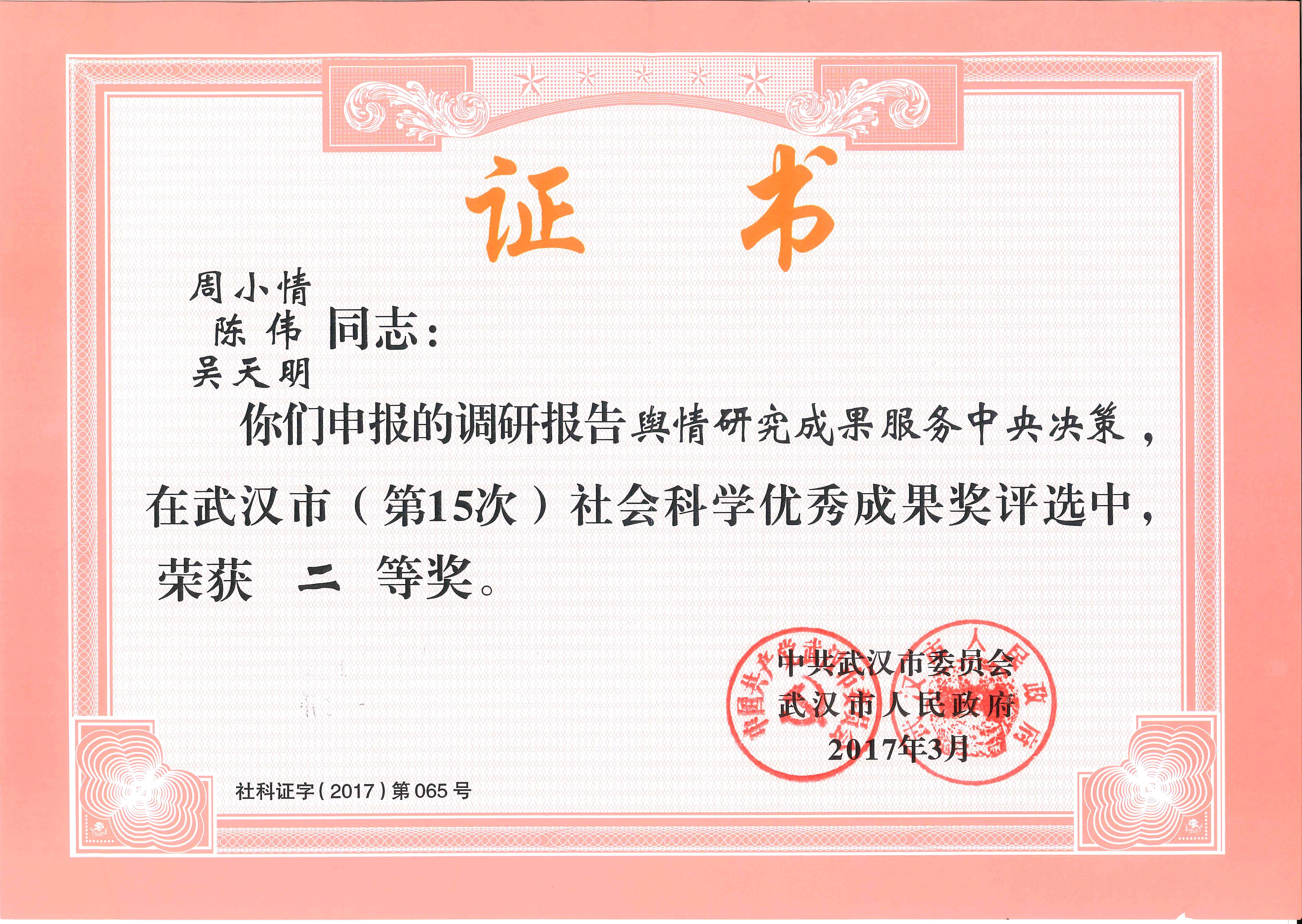 武汉市第十五次社会科学优秀成果奖二等奖