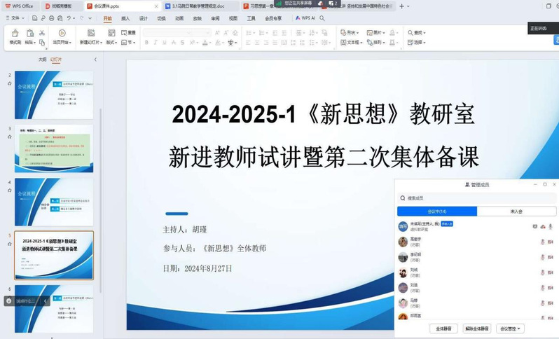 通讯员 胡瑾)为了及时把握思想政治理论课的新变化和新要求,帮助新教师成长,根据课程的教学计划和教案,马克思主义学院“习概和形策”教研室于2024年8月27日组织线上试讲暨第二次集体备课会,《新思想》全体任课教师参加。