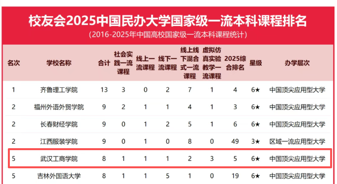 据悉,校友会中国大学排名基于“大平台、大团队、大项目、大成果、大校友”体系框架,对中国大学办学质量进行系统评价,历经23年发展,已成为具有广泛社会影响力、公信力与参考价值的大学排名品牌。本次排名统计对象为2016年至2025年间以高校为第一建设单位获认定的国家级一流本科课程。
