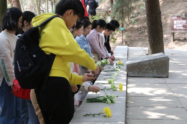 图为学生代表们正在革命烈士陵园祭拜烈士 摄影:唐明悦