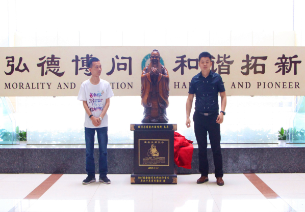 随后,校团委书记邱玉添与校友代表沈勇共同为捐赠的孔子雕像揭幕,校友会办公室主任罗茵为校友颁发捐赠证明。