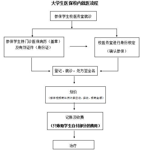 (1)校内门诊就医流程 :持门诊医保病历及有效证件(学生证和身份证)到挂号窗口进行身份核定→登记→就诊→划价→记账(医保基金直接按报销比例记账报销)→收费(学生只支付自费部分)→治疗。