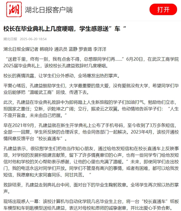 “送君千里,终有一别,我有点舍不得,总想跟同学们再……”6月20日,在米乐mile官方网站2025届毕业典礼上,该校校长孔建益致辞时几度哽咽。