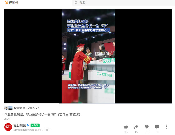 极目育见视频号:毕业典礼现场,毕业生送校长一台“车”