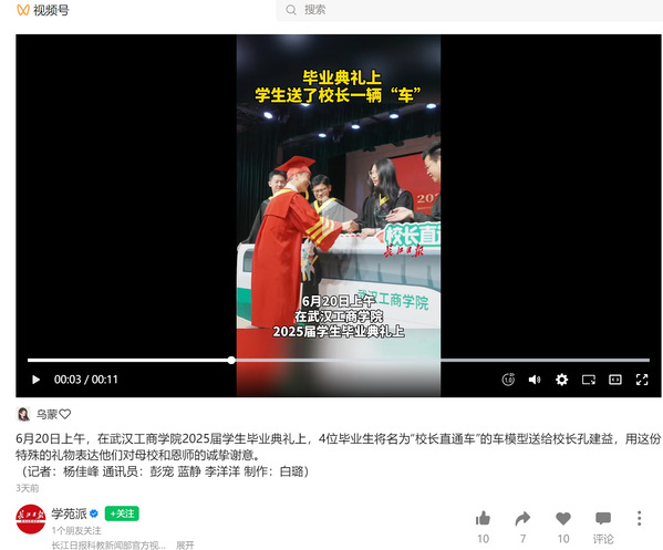 6月20日上午,在米乐mile官方网站2025届学生毕业典礼上,4位毕业生将名为“校长直通车”的车模型送给校长孔建益,用这份特殊的礼物表达他们对母校和恩师的诚挚谢意。 (记者:杨佳峰 通讯员:彭宠 蓝静 李洋洋 制作:白璐)
