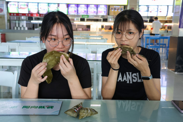 据学校后勤管理部工作人员介绍,去年和今年的端午节,学校都向全校学生免费发放了粽子,今年发放的粽子有豆沙、蜜枣和八宝3个口味,全校学生可凭统一发放的餐券前往学校一食堂和二食堂一楼免费领取1个粽子。在1栋学生宿舍332寝室,学生们拿着粽子高兴地拍照留念,并一起品尝。寝室内文法学院大二学生詹兰芳一边吃粽子一边介绍道:“我来学校不到两年,就已经吃了两次免费的校庆餐和两次免费的粽子了,粽子甜甜的,心里暖暖的!”